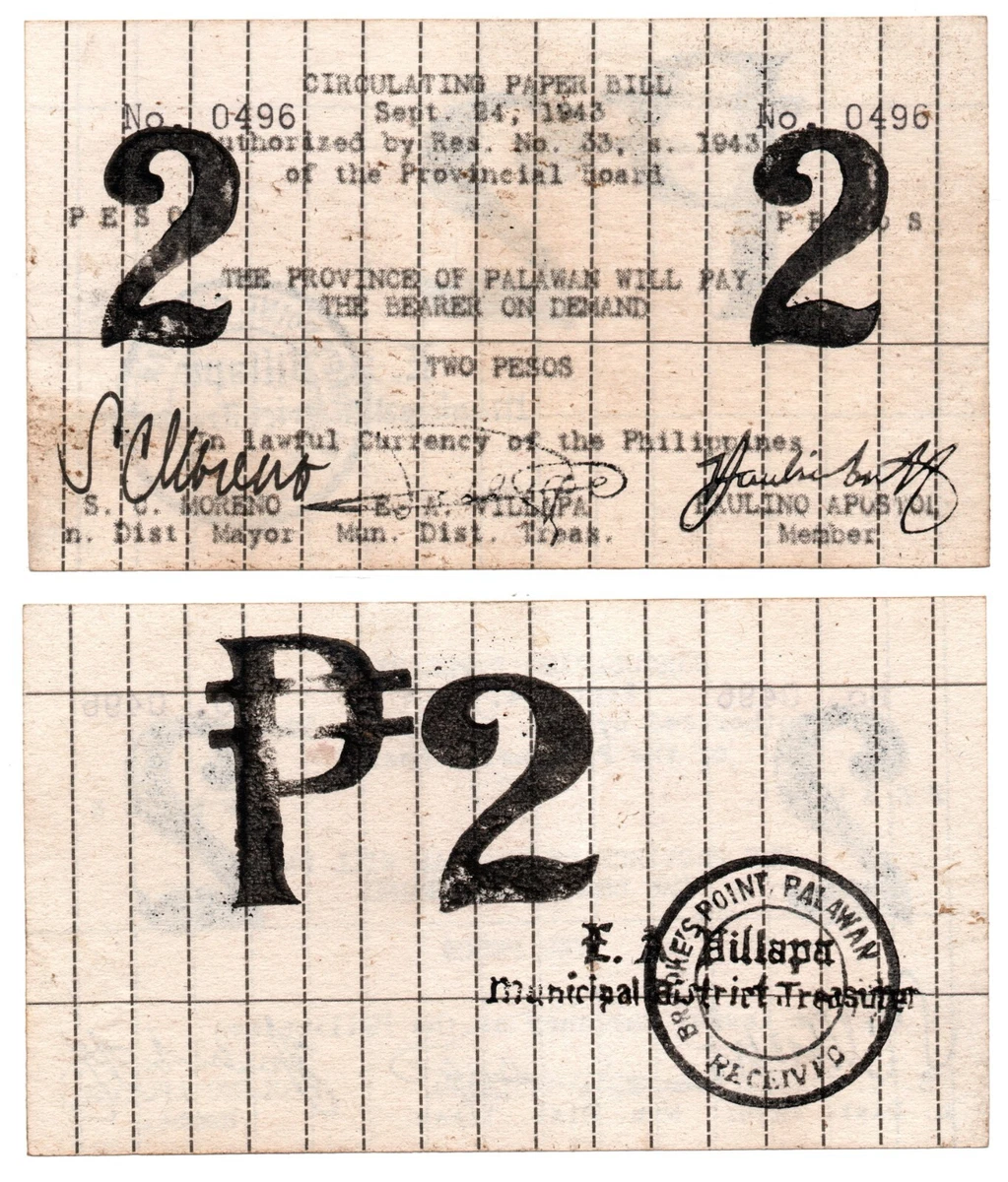 1943 PHILIPPINES Brooke’s Point PALAWAN 2 Pesos S926b WW2 Paper