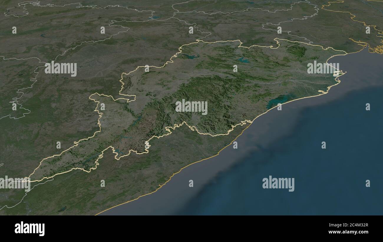 Zoom in on Odisha (state of India) outlined. Oblique perspective